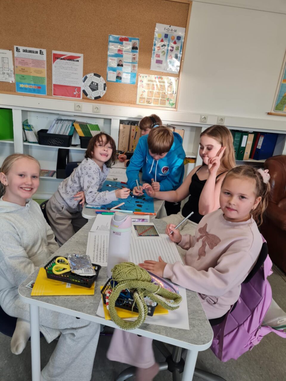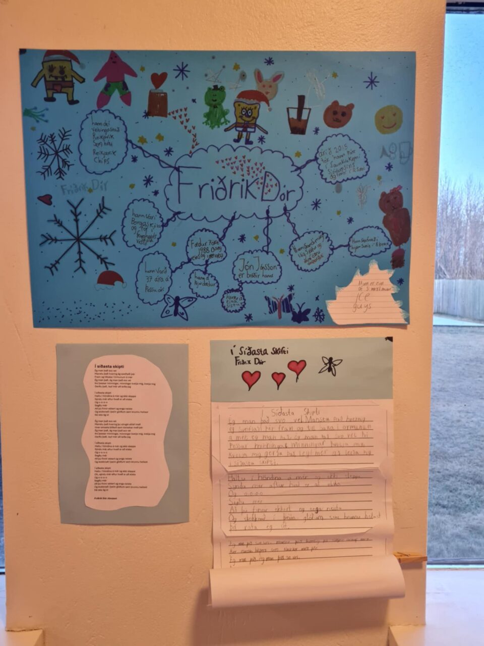Síðan unnu krakkarnir í 4.-5. og 6. bekk saman verkefni tengt þessum degi. Unnið var í aldursblönduðum hópum þar sem hver hópur valdi sér einn íslenskan textahöfund, aflaði sér ýmissa upplýsinga um hann og setti á plaköt. Þá valdi hópurinn sér einnig einn texta (lag) og vann með þann texta. Hópavinnan var lífleg og gekk vel. Verkefnin prýða nú gang miðstigsins.