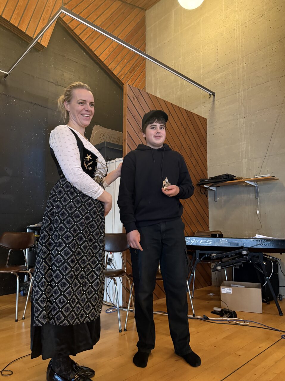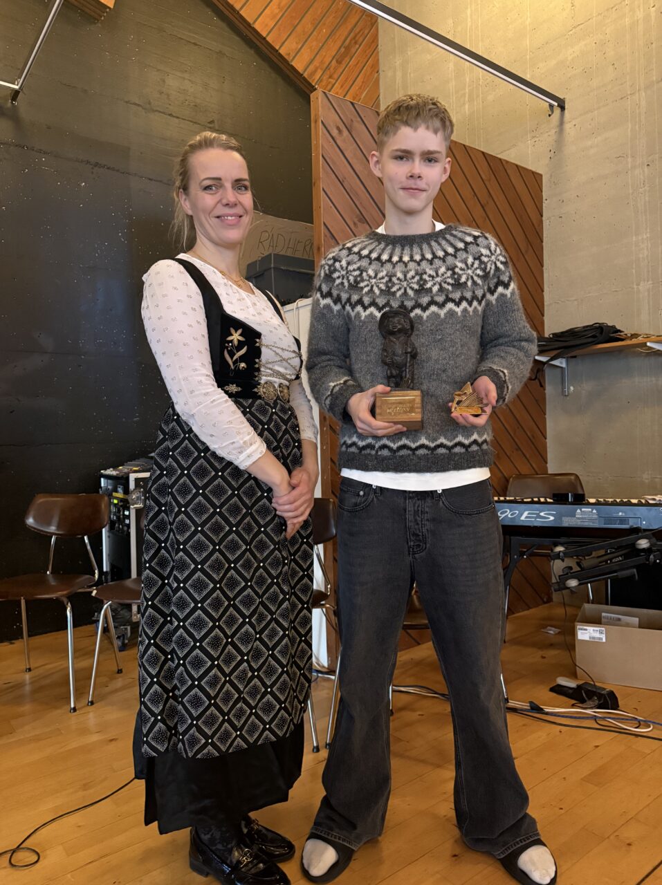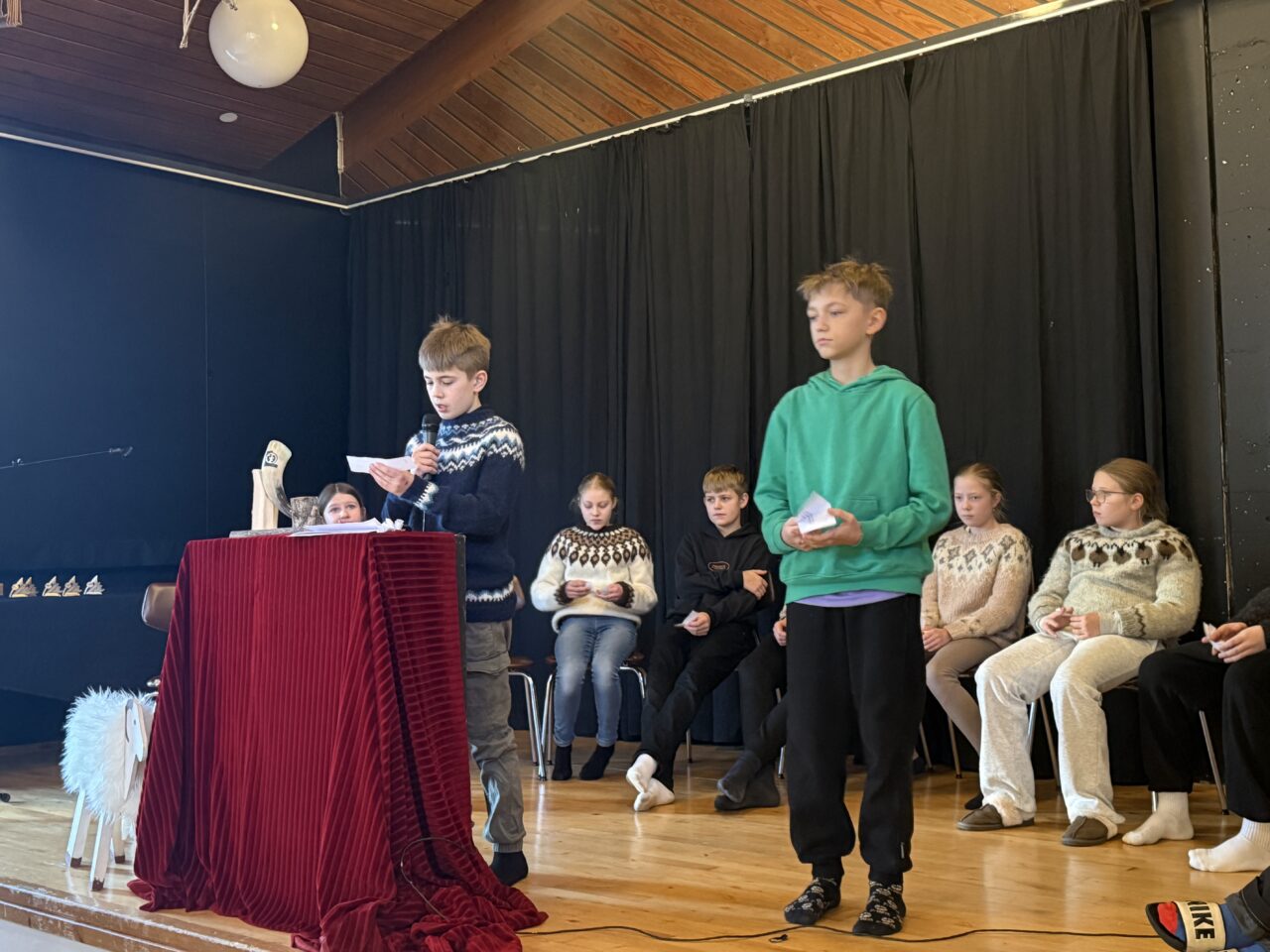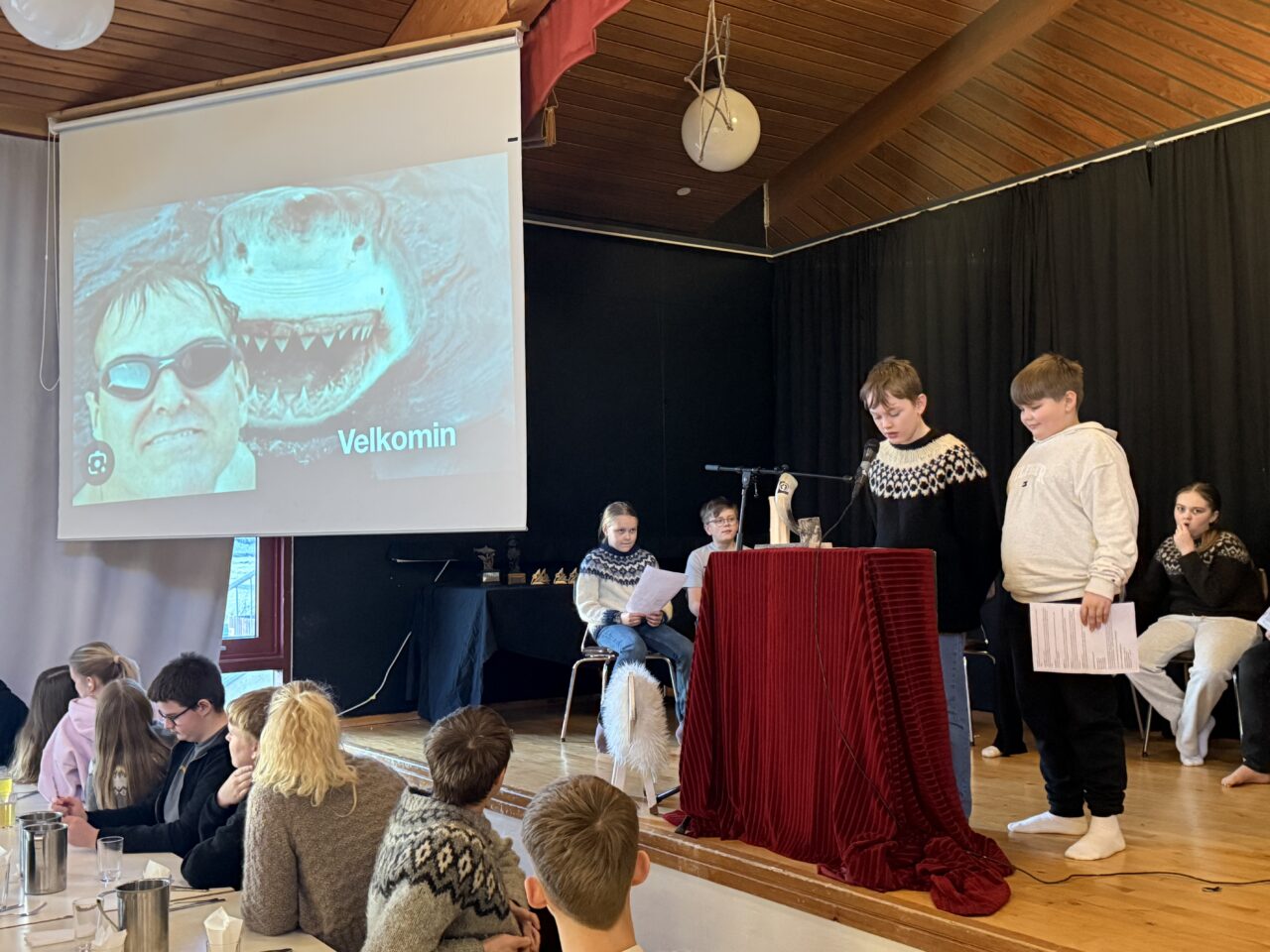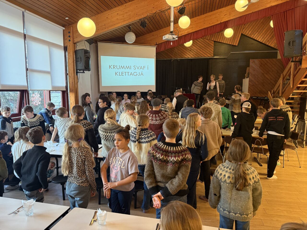 Víkingur Almar og Viktor Logi í 10. bekk voru kynnar viðburðsins og stóðu sig með prýði. Fyrsta mál á dagskrá þegar nemendur höfðu safnast saman í matsalnum var að syngja saman Krummi svaf í klettagjá. Að því loknu var 6. bekkur með kynningu á þorramat.