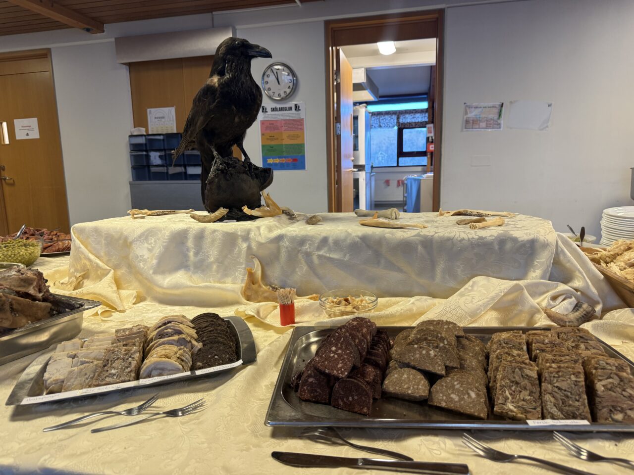 Þá kom loksins að því að borða. Hefð er fyrir að dregið sé í matarröð og sáu Víkingur og Viktor um það. Í ár var það 1. bekkur sem var svo heppinn vera fyrstur í hlaðborðið. Mikael og Karen göldruðu fram lygilega góðan þorramat og nutu aðstoðar 10. bekkjar, sem lögðu einnig á borð.