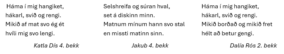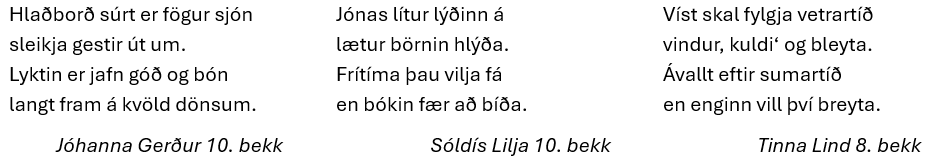 Það var síðan hún Bjartey í 3. bekk sem þótti vera með besta vísubotninn á yngsta stigi. Hann hljóðaði svo: