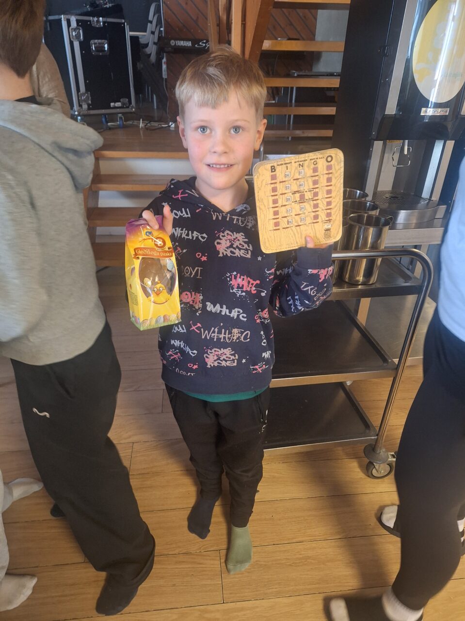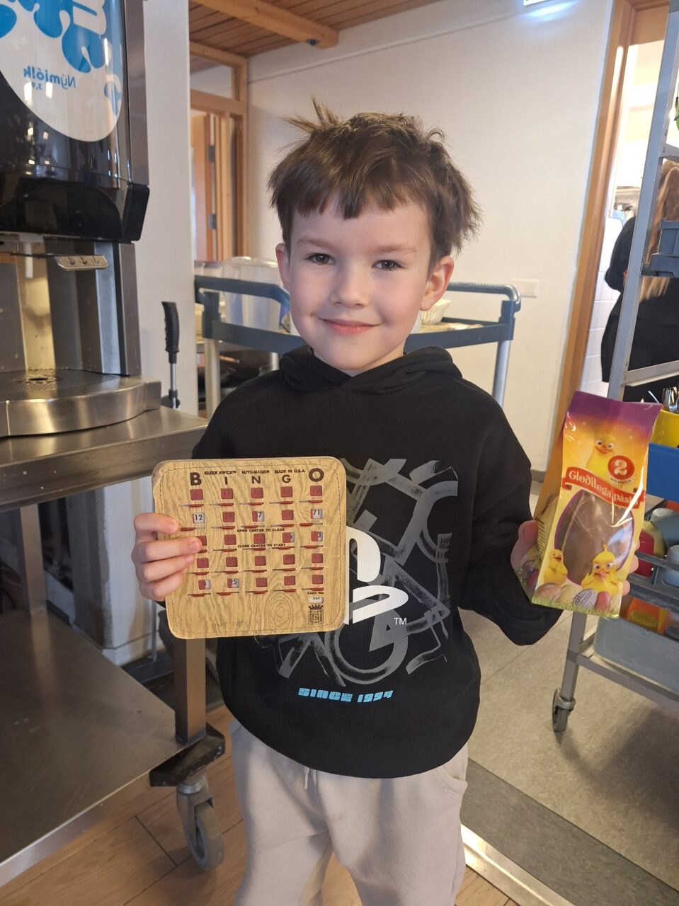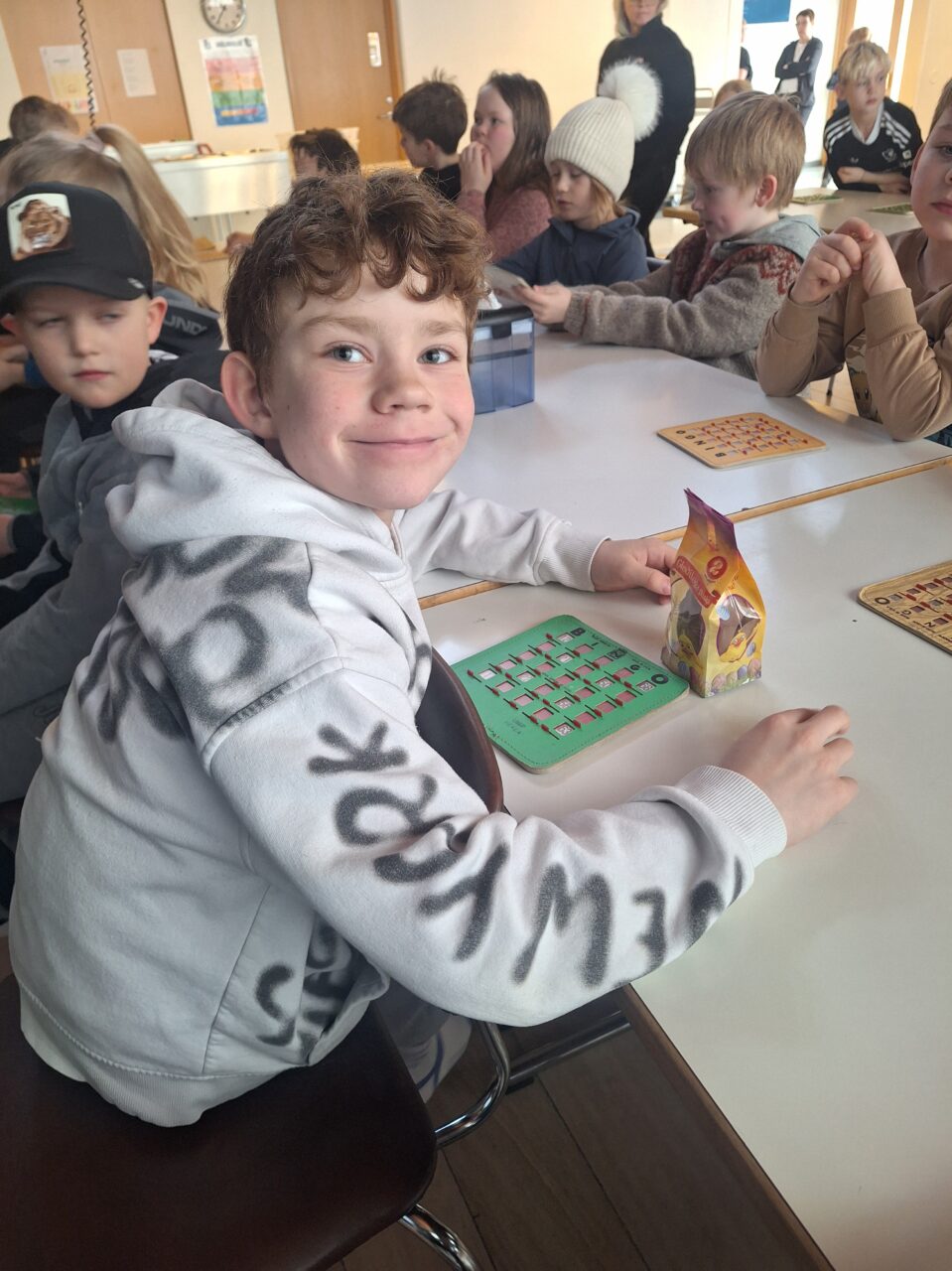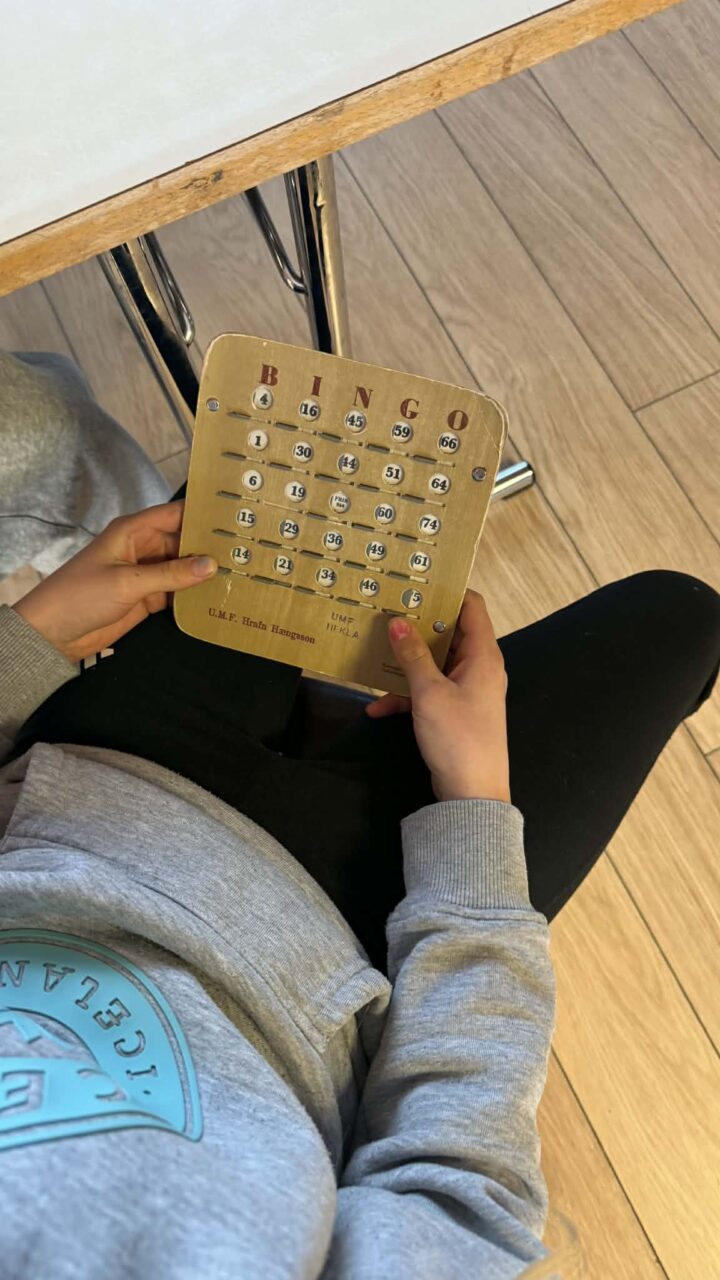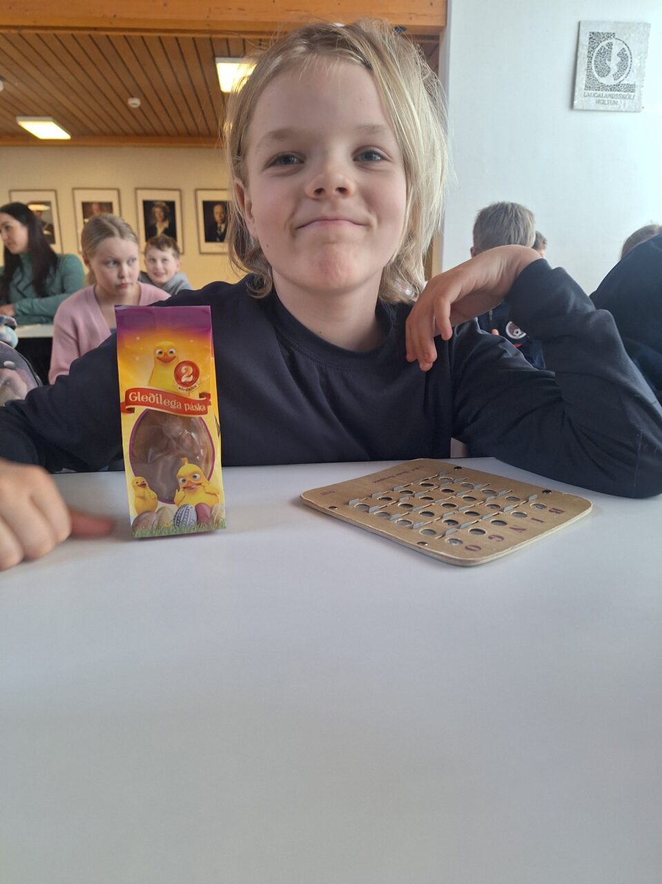 Þar sem 7. til 10. bekkur er í fríi í dag vegna sameiginlegrar árshátíðar grunnskólanna á svæðinu á Hvolsvelli í gærkvöldi var skellt í páskabingó með nemendum í 1. til 6. bekk í morgun. Bingóið tókst einstaklega vel en Bæring Jón kennari sá um að lesa upp tölurnar og stjórna bingóinu.