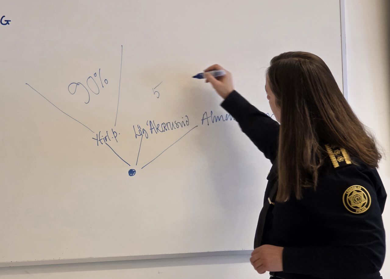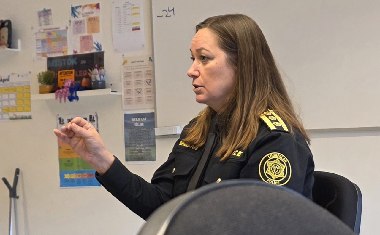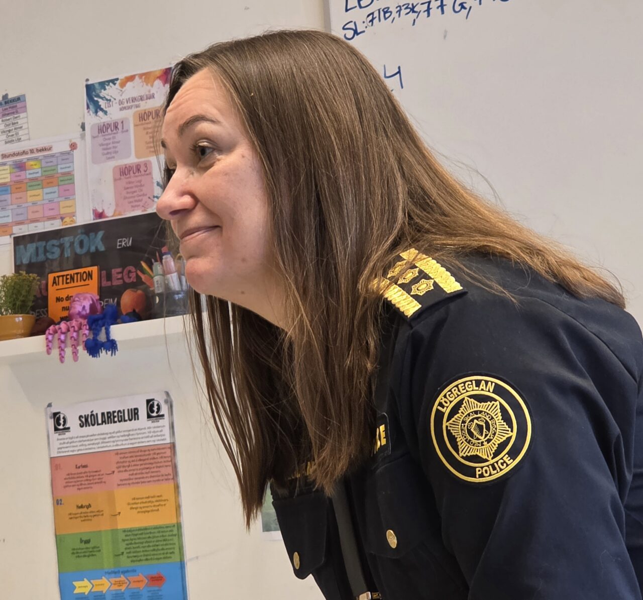 Arndís Soffía notaði m.a. töfluna til að skýra fyrir nemendum hvernig skipulagið væri hjá lögreglunni en um 120 starfsmenn vinna hjá lögregluembættinu.